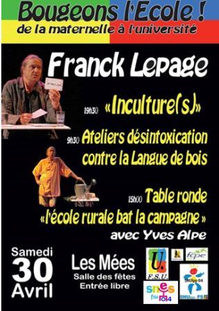 Le matin à partir de 9h30 Franck Lepage animera des « Ateliers de désintoxication de la langue de bois ». Réservations : 06 07 39 80 90 puis l’après midi une table ronde et des débats sur le thème « L’école rurale bat la campagne : sortir des sentiers battus » et le soir « Inculture(s) ». auront lieu