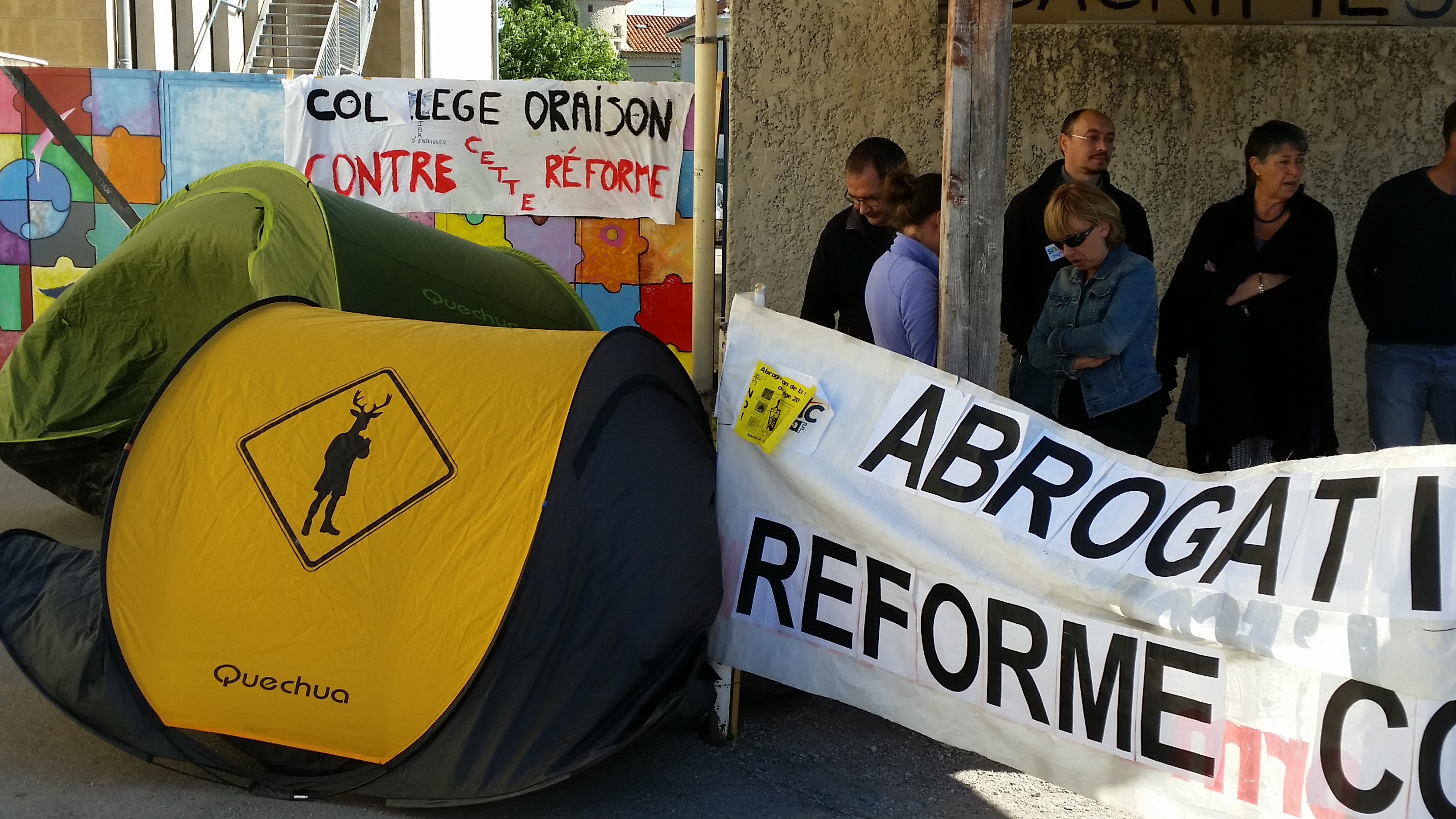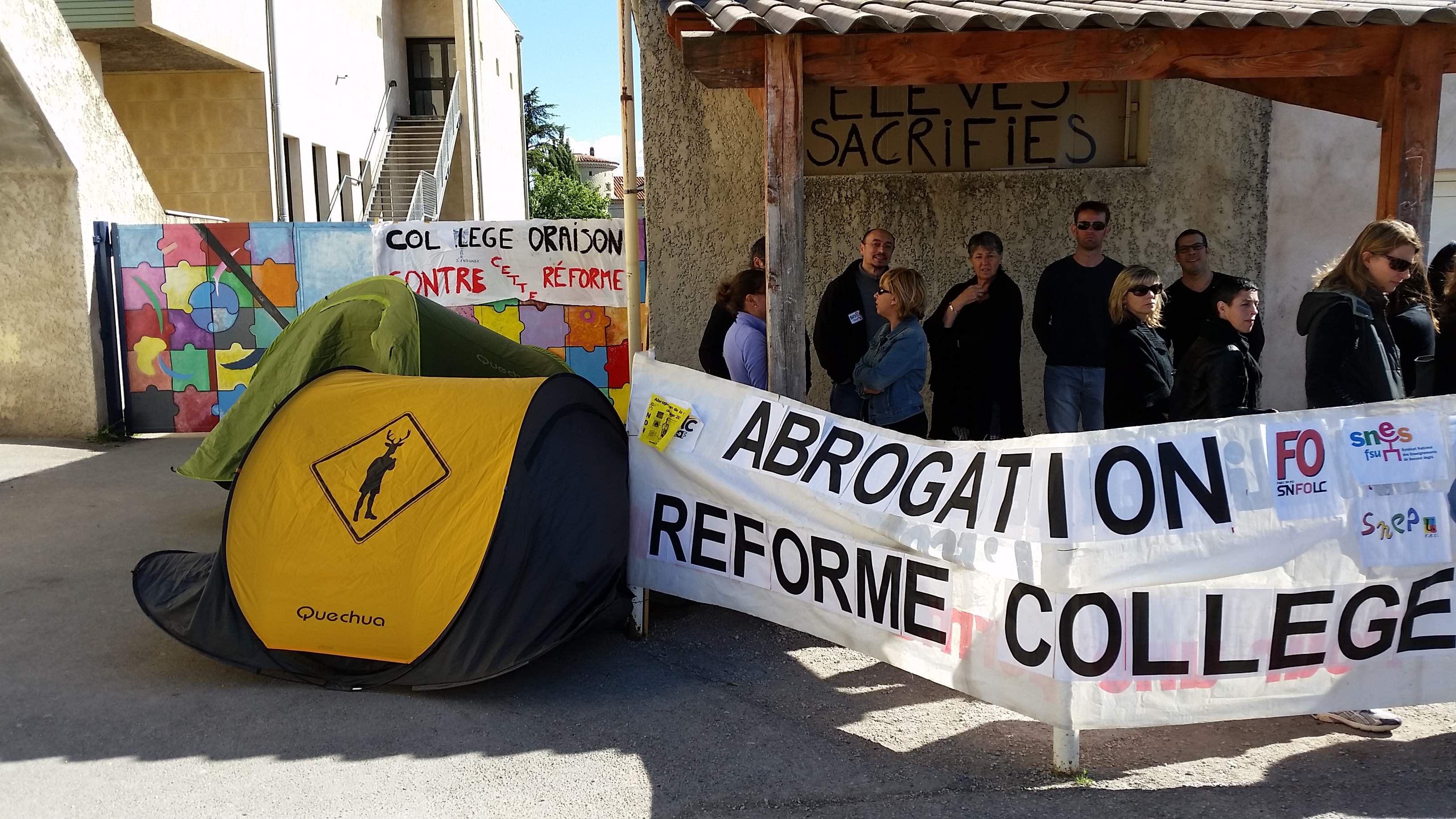 Vers 17h, plusieurs représentants des collèges des alentours sont regroupés devant le collège d’Oraison, pancartes, banderoles et tentes sont installées devant l’entrée des élèves.