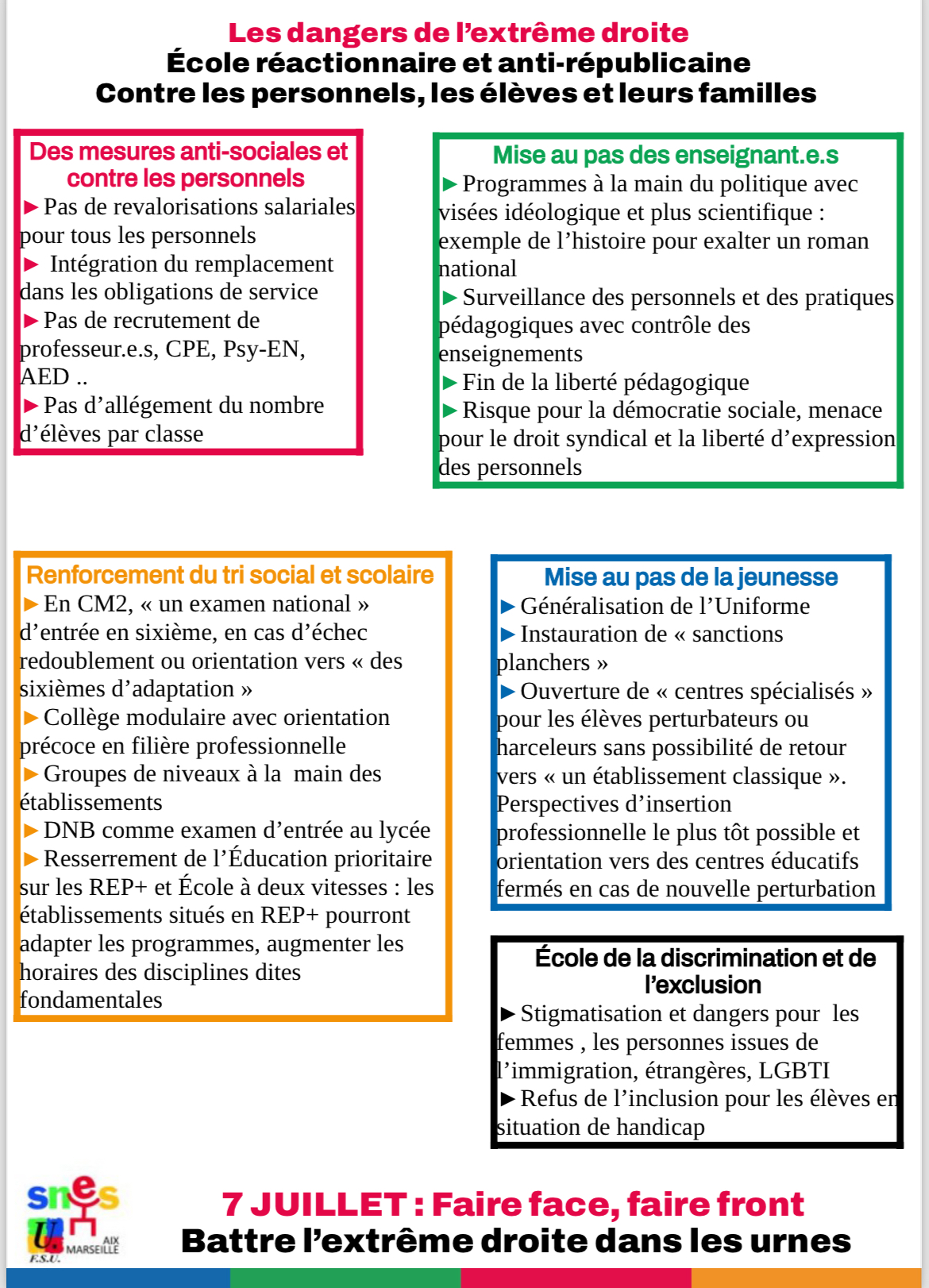 Sur le fond, l’extrême droite ne condamne jamais l’insuffisance des moyens, ni ne parle de la dégradation des conditions de travail. Jamais elle ne porte un regard critique sur les inégalités scolaires et sociales des élèves. On ne trouve rien dans leurs programmes qui permettrait de résoudre les fragilités du système éducatif. Derrière une discours prétendument social, elle promeut en réalité l’obscurantisme, l’autoritarisme, la haine, le racisme, l’antisémitisme, les LGBTIphobies, le sexisme. L’École est aujourd’hui à un point de bascule et va mettre des années à se remettre des politiques menées notamment depuis 2017, mais si l’extrême droite arrive au pouvoir, l’Ecole publique ne s’en remettra pas.