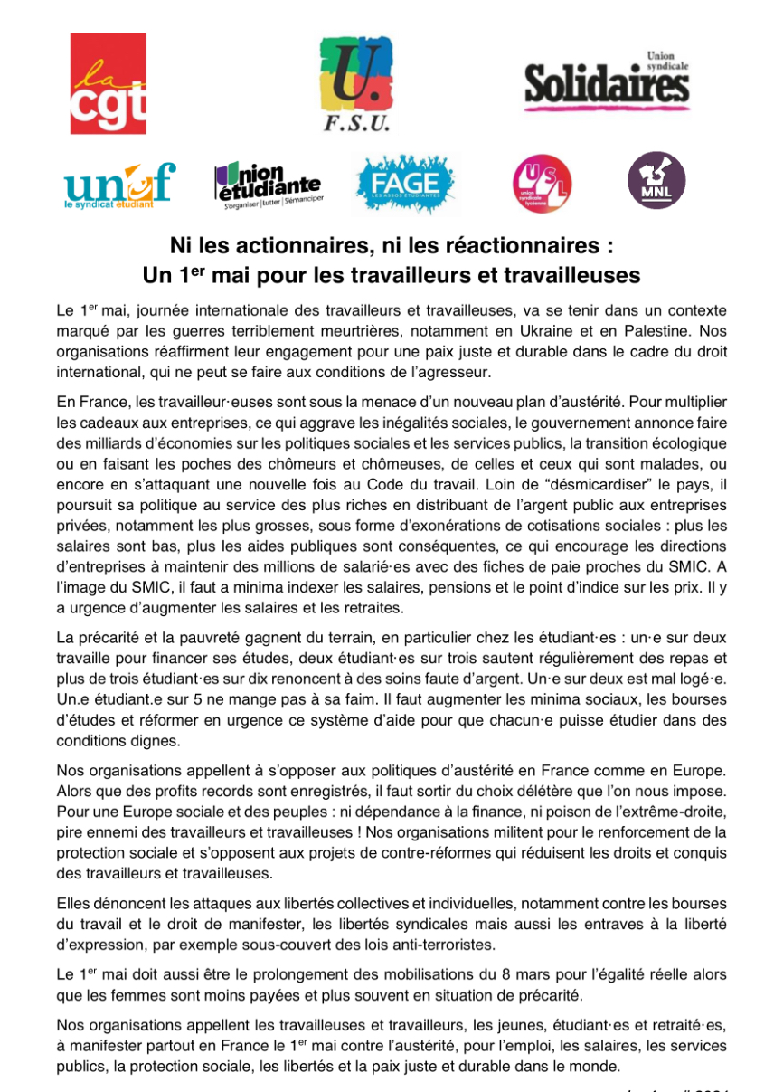 Le 1er mai, journée internationale des travailleurs et des travailleuses s’inscrit dans un contexte national d’austérité, de poursuites des attaques contre la fonction publique avec le projet de loi de Stanislas Guerini, contre l’École avec le choc des savoirs qui assume pleinement le tri des élèves et la fin du collège pour tous les élèves.