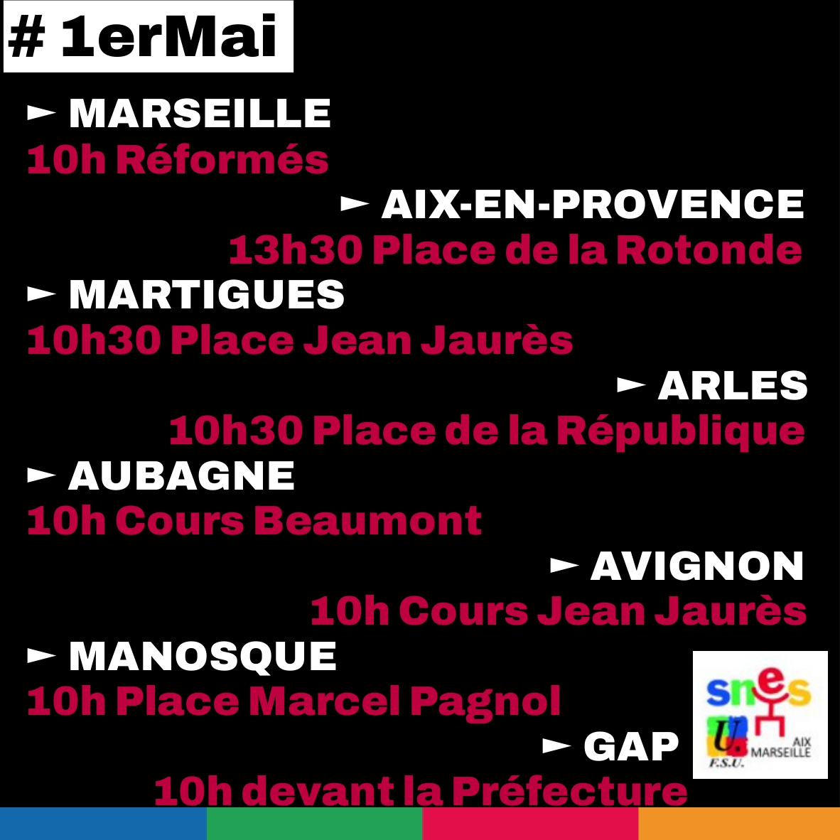 Le SNES Aix-Marseille appelle à faire de ce 1er mai une journée de forte mobilisation pour la défense des services publics, pour le choc des moyens et des salaires, contre le choc des savoirs et le tri social, pour la paix et les solidarités internationales des travailleurs et travailleuses. Disons haut et fort à ce gouvernement que nous refusons sa politique d’austérité et son mépris pour la jeunesse !