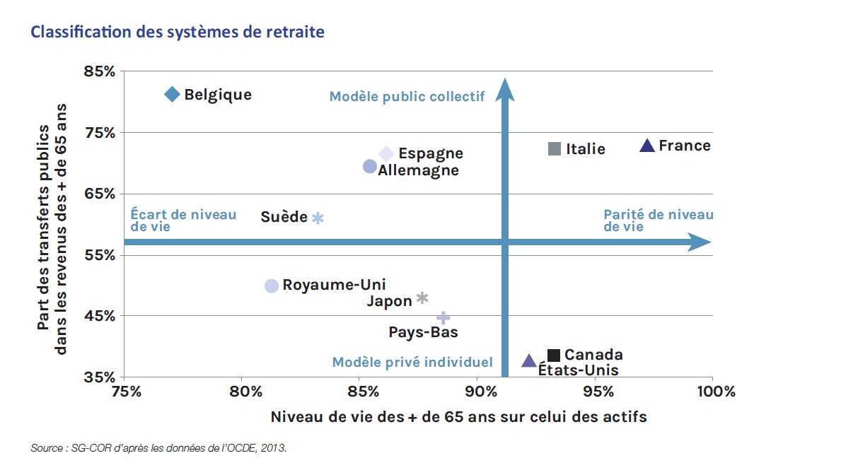 La France est caractérisée par le haut niveau de ses retraites obligatoires, publiques et par répartition (les cotisations versées servent immédiatement à payer les retraites) qui garantissent aujourd’hui une quasi parité de niveau de vie entre retraités et actifs. Serait-ce le problème, ou bien plutôt la solution ?