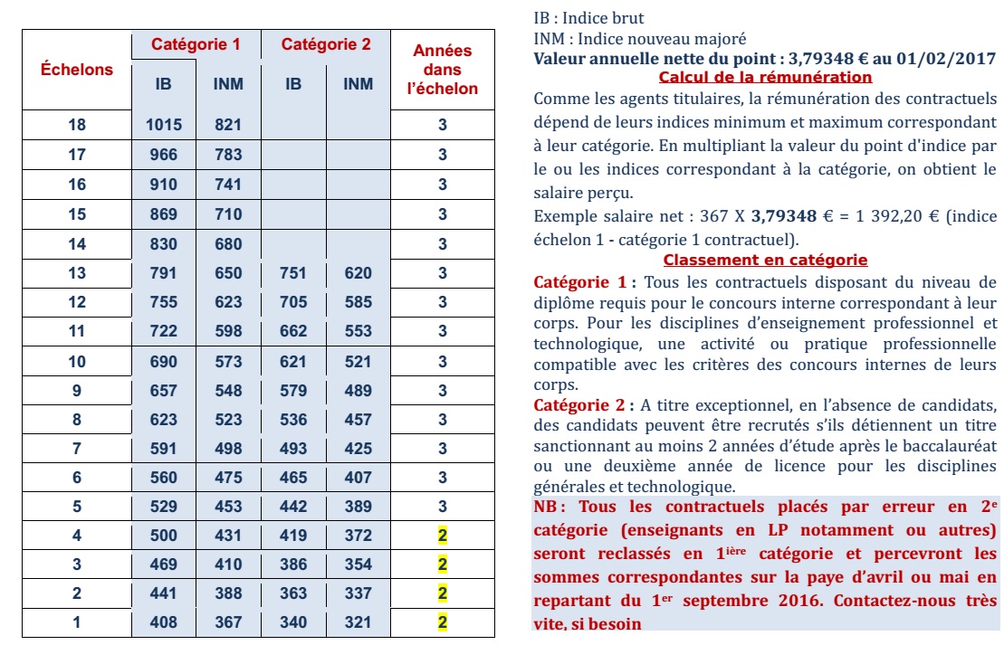 Mise en place d’une grille indiciaire revalorisée pour les contractuels en CDD et CDI, classement en 1re catégorie de tous les professeurs exerçant en lycée professionnel détenteur du diplôme exigé dans les concours internes ou prise en compte de l’expérience professionnelle, bonifications en points d’indices supplémentaires pour valoriser certaines prises de postes, durée des contrats étendue à toute la durée effective du remplacement (fin des contrats « dix mois » !), évaluation professionnelle alignée sur celle des fonctionnaires, avec possibilité de demande de réexamen en commission consultative des agents non titulaires, nouvelles mesures de formations…